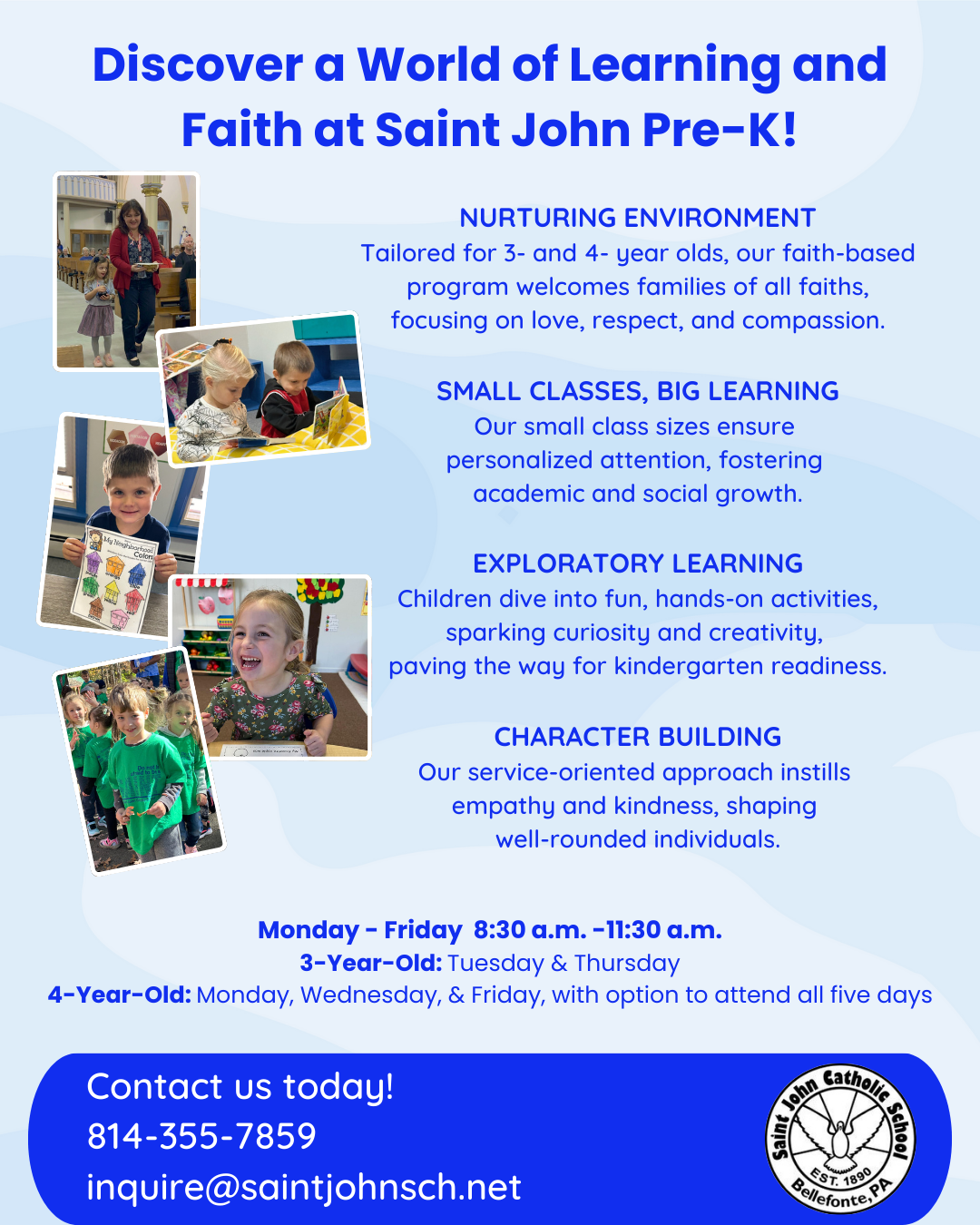 Saint John Catholic School Council has established that the Pre-K Classes will be as follows: