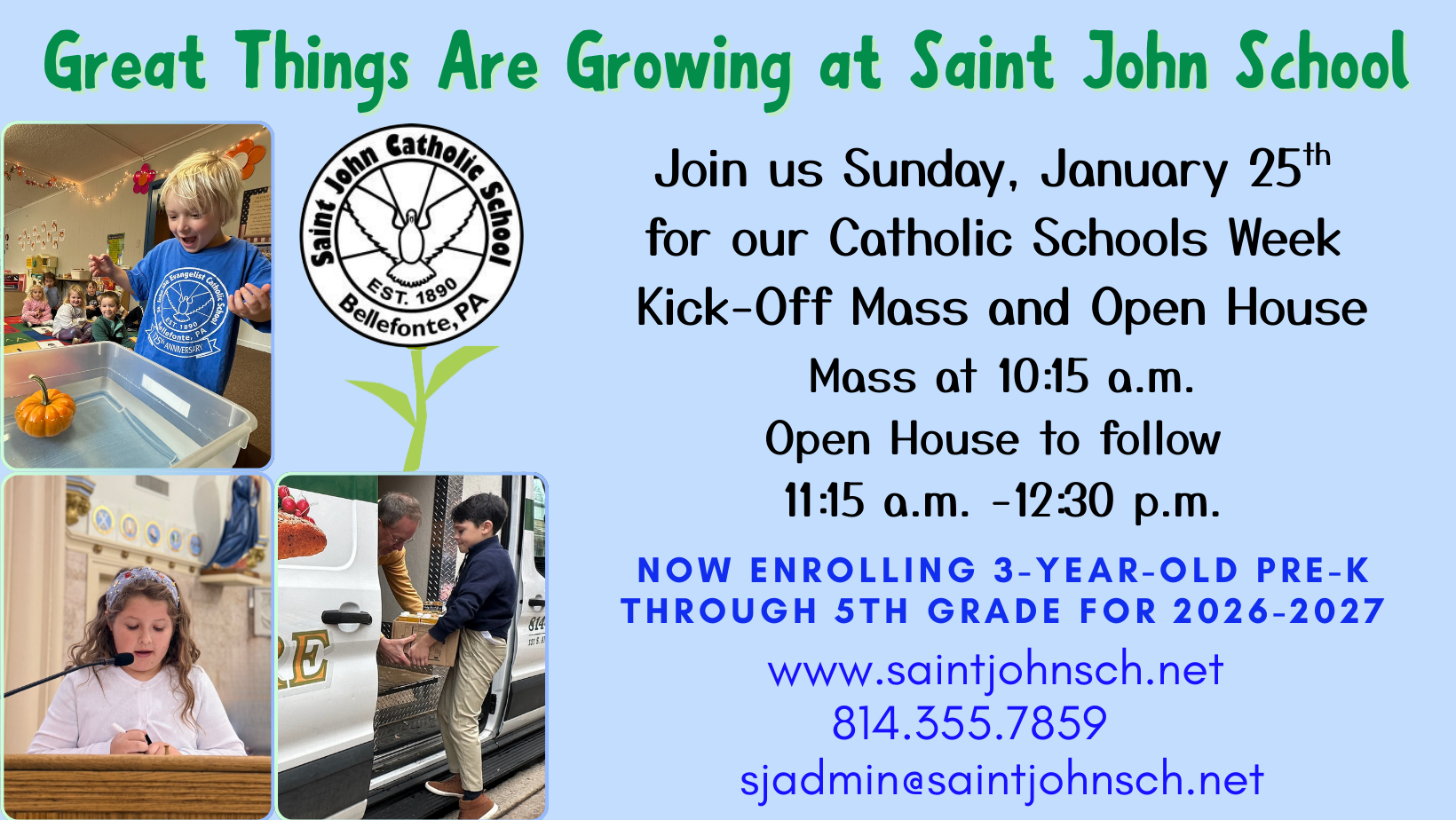 Nestled in the heart of Bellefonte, Saint John School has been serving families of all faiths since 1890. We continue the mission of the IHM Sisters by providing strong academics in a faith-filled environment. Offering both 3- and 4 year-old Pre-Kindergarten classes, as well as full-day instruction in Kindergarten through grade 5, we work closely with CIU 10 and our local school districts, to provide students access to Enrichment, Speech & Language, Occupational Therapy, Counseling, and remedial Math and Reading services, including Title I Reading. Alongside traditional curriculum, students enjoy Art, Music, Band, Choir, Technology, and Physical Education. Current technology is abundant at Saint John. From Chromebooks for every K-5 student and iPads for every Pre-K student, we balance new practices with traditional ones. Above all, Religion is more than a class. Students learn and live the Catholic faith in all aspects of their day. We are truly a thriving Catholic school.