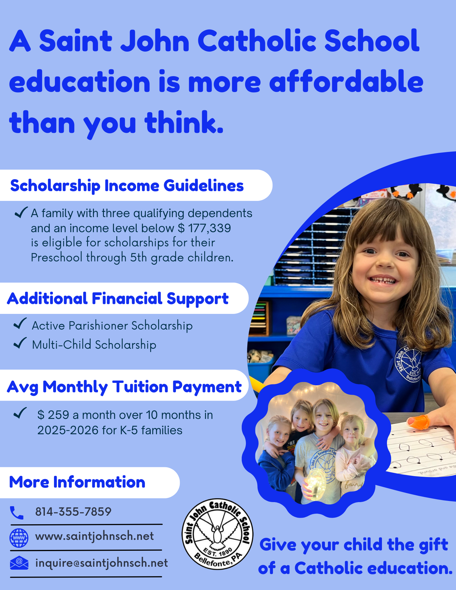 Saint John the Evangelist Catholic School has a total of $3,000 in Bridge Foundation K-5 EITC tuition scholarships. Families with children in grades K-5 programs can apply for the 2024-25 school year. This is an income-based scholarship with the limits being $108,444 Adjusted Gross Income, with an additional $19,088 adjustment for each dependent.